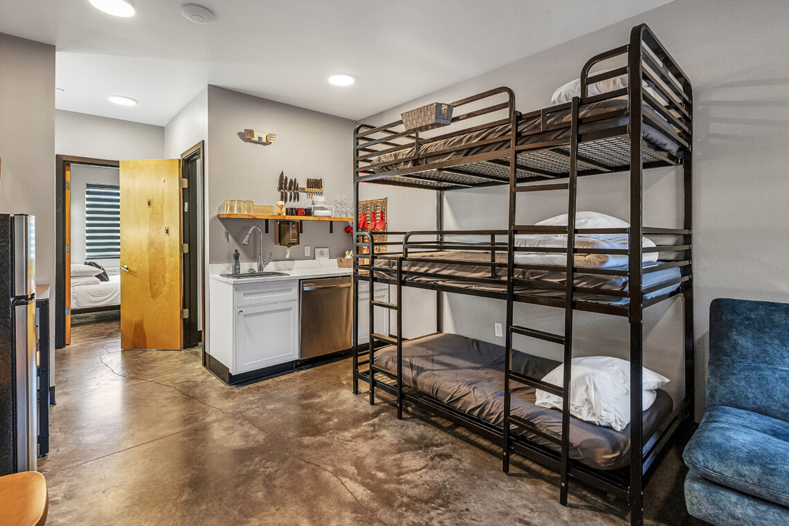 This suite is ideal for couples and families, accommodating up to five guests. Features include a private queen bedroom, triple bunk beds in the family room, and a Serta futon for extra sleeping space. Enjoy a full bathroom with tub/shower combo and a private first-floor entrance.